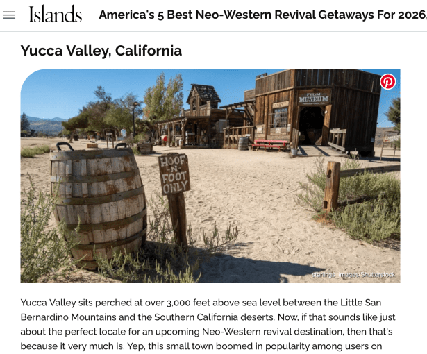 The Town of Yucca Valley ranked in another tourism list: “America’s 5 Best Neo-Western Revival Getaways For 2026, According To Studies” by Islands.